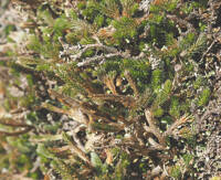 Leaves monomorphic, arranged in somewhat alternating pseudowhorls of 4, appressed tightly or loosely, ascending, green, linear-lanceolate, generally 1.8-3.5 mm long and 0.4-0.7 mm broad, ridges on underside of leaves well defined, base rounded and adnate or cuneate and somewhat decurrent on loosely appressed stem leaves, pubescent or rarely glabrous; margins short-ciliate to finely toothed, cilia transparent, ascending toward apex; apex keeled and obtuse, occasionally attenuate or plane and attenuate, abruptly ending with short or long bristle; bristle transparent to slightly white, puberulent, sometimes breaking off, usually 0.2-0.5 mm; sporophylls usually deltate-ovate on exposed, compact mats, lanceolate-ovate on loose mats in wet habitats, ridges beneath well defined, base glabrous, margins short-ciliate to finely toothed, apex keeled, abruptly ending with short bristle, rarely tapering to bristle.